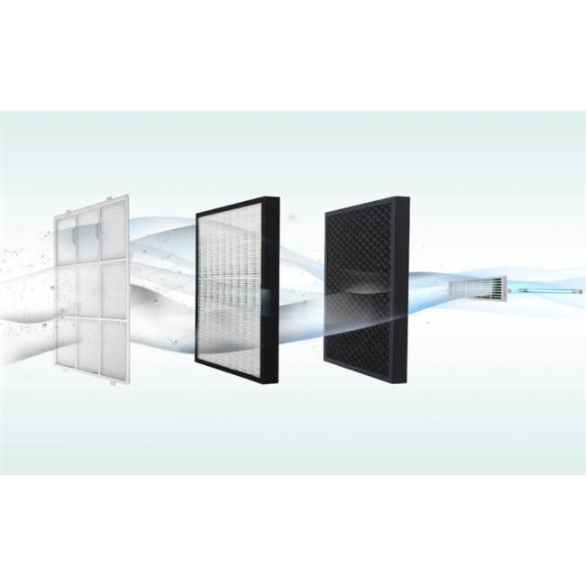 - Φίλτρο TiO2 + UV light: ο συνδυασμός των δυο έχει ως αποτέλεσμα την δημιουργία πολύ δραστικών ηλεκτρόνιων. Όταν αυτά έρθουν σε επαφή με επιβλαβή σωματίδια δημιουργείται χημική αντίδραση που τα καταστρέφει