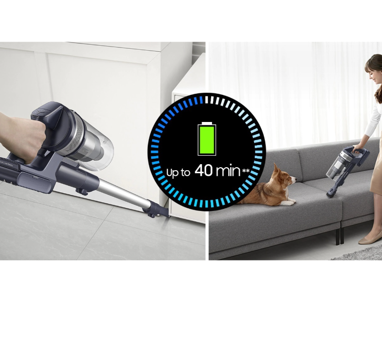 Επαναφορτιζόμενη σκούπα Samsung stick, με μεγάλη αυτονομία έως 40 λεπτά για να καθαρίζεις μονομιάς κάθε γωνιά του σπιτιού και φίλτρο HEPA, για ατμόσφαιρα που αποπνέει καθαριότητα!