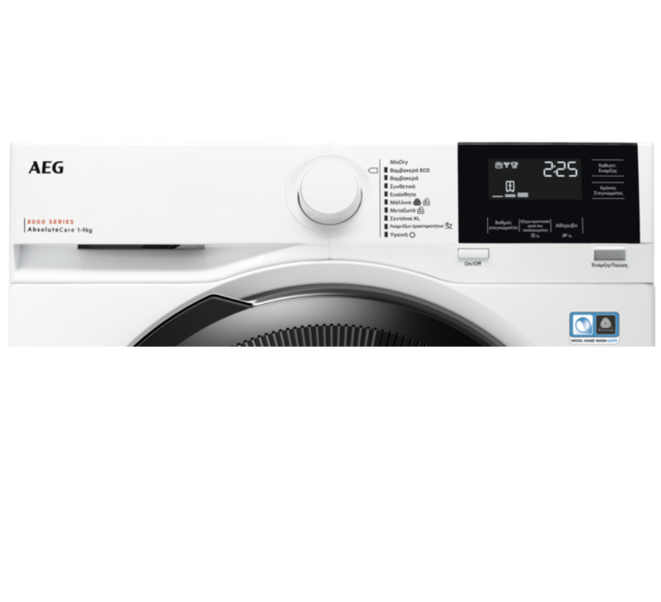 Ενδείξης φάσης στεγνώματος για: Στέγνωμα, Φάση ψύξης, Στέγνωμα για σιδέρωμα, Στέγνωμα για αποθήκευση, Επιπλέον στέγνωμα, Προστασία κατά τσαλακώματος/τέλος
