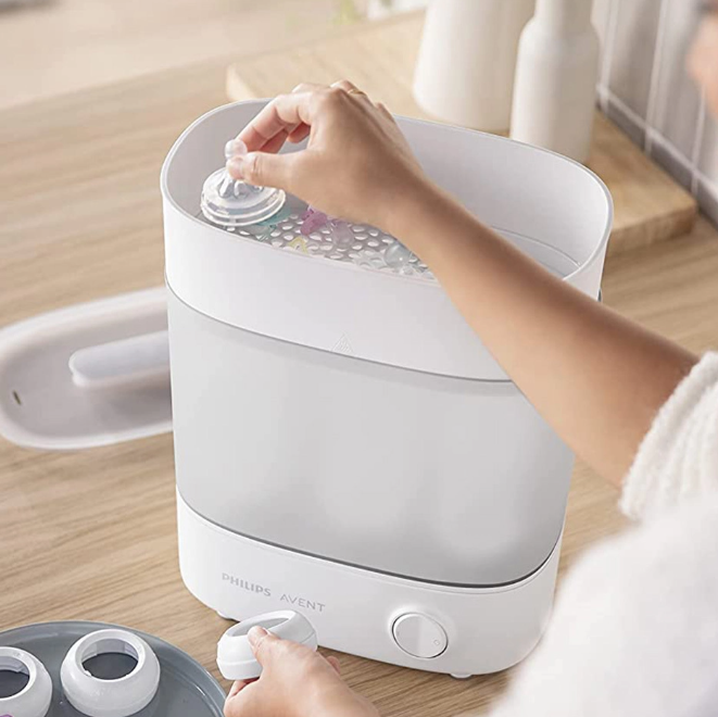 Ο Ηλεκτρικός Αποστειρωτής Ατμού 3 σε 1 της Avent χρησιμοποιεί φυσικό ατμό για την αποστείρωση μπιμπερό και άλλων προϊόντων, σκοτώνοντας το 99,9% των βλαβερών μικροβίων χωρίς τη χρήση χημικών σε μόλις 6 λεπτά.