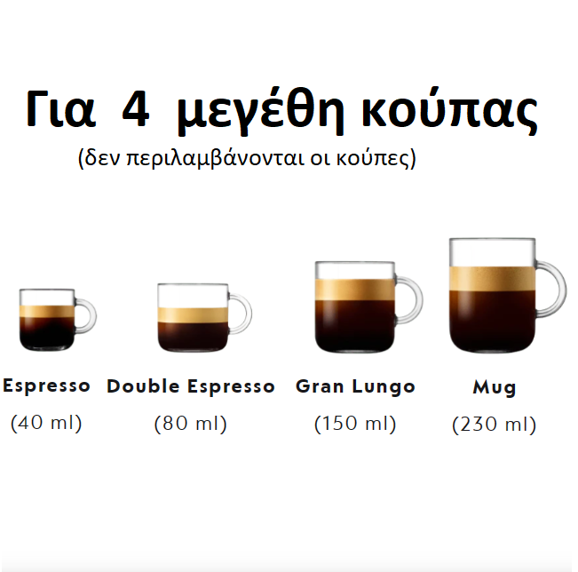 ΓΙΑ 4 ΜΕΓΕΘΗ ΚΟΥΠΑΣ : Η Vertuo ανατρέπει τα καθιερωμένα και σας προσφέρει την εμπειρία ενός απολαυστικoύ καφέ, από Espresso έως Signature Mug. Απολαύστε την τέλεια κούπα καφέ με το πάτημα ενός κουμπιού χάρη στην τεχνολογία εκχύλισης Centrifusion, που ενισχύει τα αρώματα κάθε χαρμανιού. Espresso, Double Espresso, Grand Lungo, Signature Mug