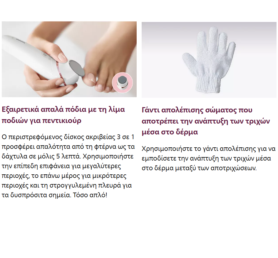 Γάντι απολέπισης σώματος που αποτρέπει την ανάπτυξη των τριχών μέσα στο δέρμα : Χρησιμοποιήστε το γάντι απολέπισης για να εμποδίσετε την ανάπτυξη των τριχών μέσα στο δέρμα μεταξύ των αποτριχώσεων.Ο περιστρεφόμενος δίσκος ακριβείας 3 σε 1 προσφέρει απαλότητα από τη φτέρνα ως τα δάχτυλα σε μόλις 5 λεπτά. Χρησιμοποιήστε την επίπεδη επιφάνεια για μεγαλύτερες περιοχές, το επάνω μέρος για μικρότερες περιοχές και τη στρογγυλεμένη πλευρά για τα δυσπρόσιτα σημεία. Τόσο απλό!