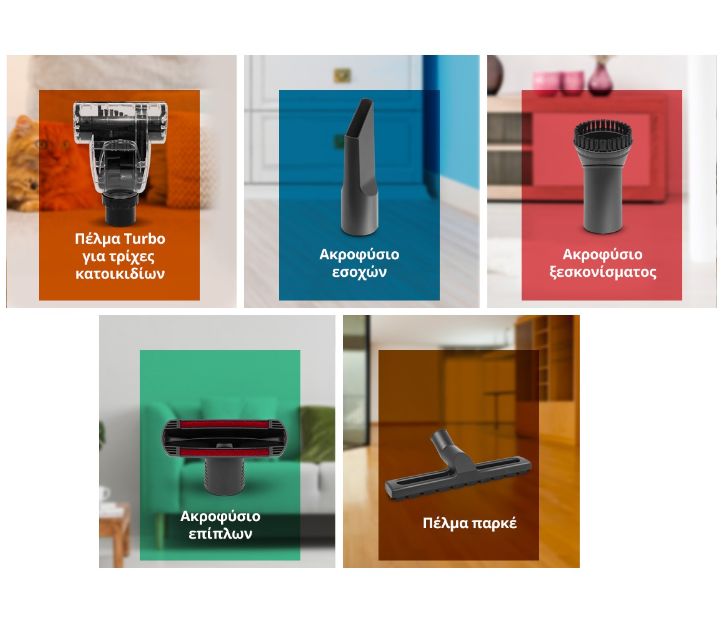 Επιπλέον Εξαρτήματα : Καθαρίστε εύκολα και γρήγορα οποιαδήποτε σημείο του σπιτιού, χάρη στις 5 επιπλέον κεφαλές της σκούπας που προσαρμόζονται σε κάθε επιφάνεια για να προσφέρουν κάθε φορά εξαιρετικά αποτελέσματα.