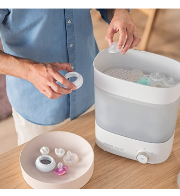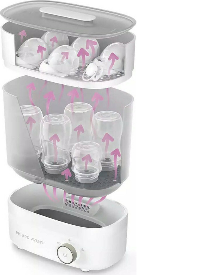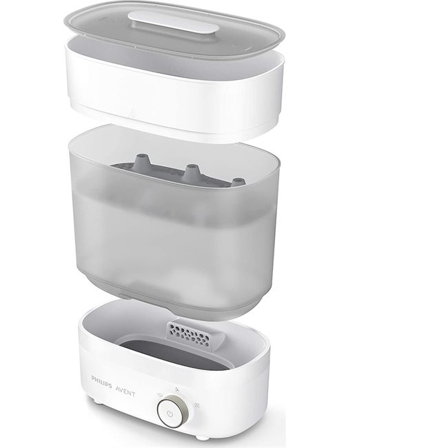 Ευρύχωρος στο εσωτερικό, αλλά συμπαγής στο εξωτερικό : Καταλαμβάνει λίγο χώρο, κι όμως χωράει μέχρι έξι μπιμπερό Philips Avent. Επίσης, χωράει και όλα τα υπόλοιπα εξαρτήματα, από θηλές και πιπίλες έως χειροκίνητο θήλαστρο.