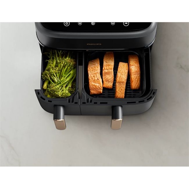 Αυτή η Airfryer της Philips με δύο καλάθια εξασφαλίζει ότι δύο γεύματα είναι ζεστά και έτοιμα ταυτόχρονα. Απολαύστε νόστιμο και υγιεινό μαγείρεμα με ένα μεγάλο συρτάρι για κυρίως πιάτα για όλη την οικογένεια και ένα μικρότερο συρτάρι για συνοδευτικά ή ατομικά γεύματα.