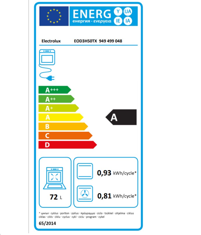 Ο συνολικός φορτίο ηλεκτρικής σύνδεσης είναι 2980 Watt, η κατανάλωση σε συμβατική λειτουργία είναι 0.93 kWh ανά κύκλο και σε λειτουργία θερμού αέρα 0.81 kWh, με δείκτη ενεργειακής απόδοσης EEI 95.3 και ενεργειακή κλάση A. Οι διαστάσεις εντοιχισμού είναι 590 x 560 x 550 mm και οι εξωτερικές διαστάσεις 594 x 596 x 569 mm. Το μοντέλο έρχεται σε φινίρισμα Inox, με τύπο πρίζας Schuko, καλώδιο 1.6 μέτρων και απαιτεί ασφάλεια 16A.