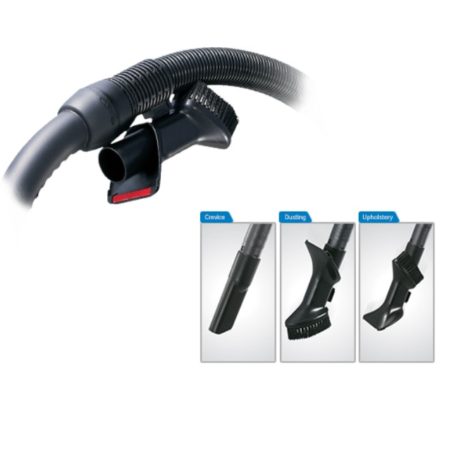 Η λαβή 3-σε-1 ενσωματώνει βούρτσα για χαραμάδες, βούρτσα ταπετσαρίας και βούρτσα σκόνης, ώστε να καθαρίζετε άνετα κάθε σημείο χωρίς αλλαγή εξαρτήματος.