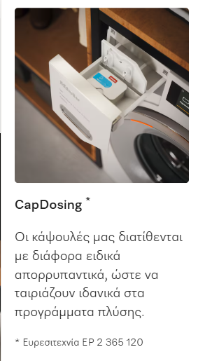 Η τεχνολογία CapDosing προσφέρει ειδικά δοσολογημένες κάψουλες για διαφορετικά είδη υφασμάτων ή λεκέδες, εξασφαλίζοντας ιδανική φροντίδα με ακρίβεια Miele.