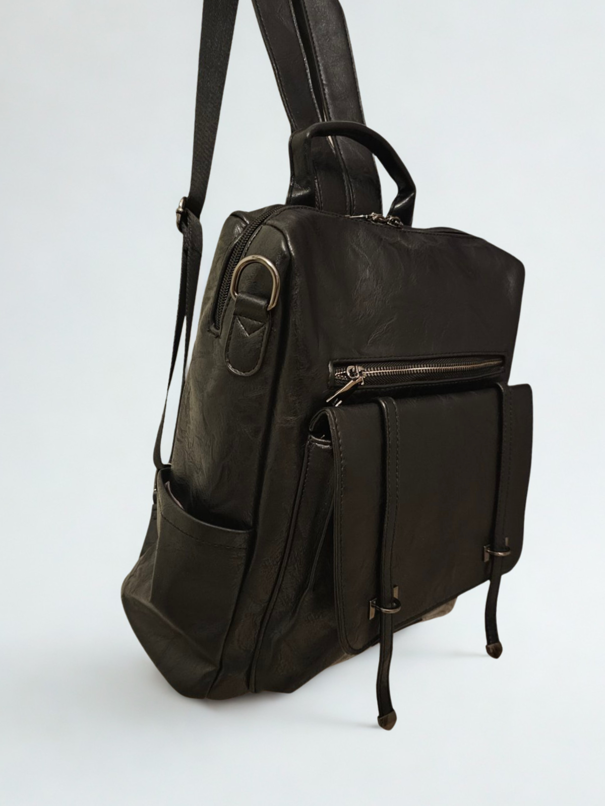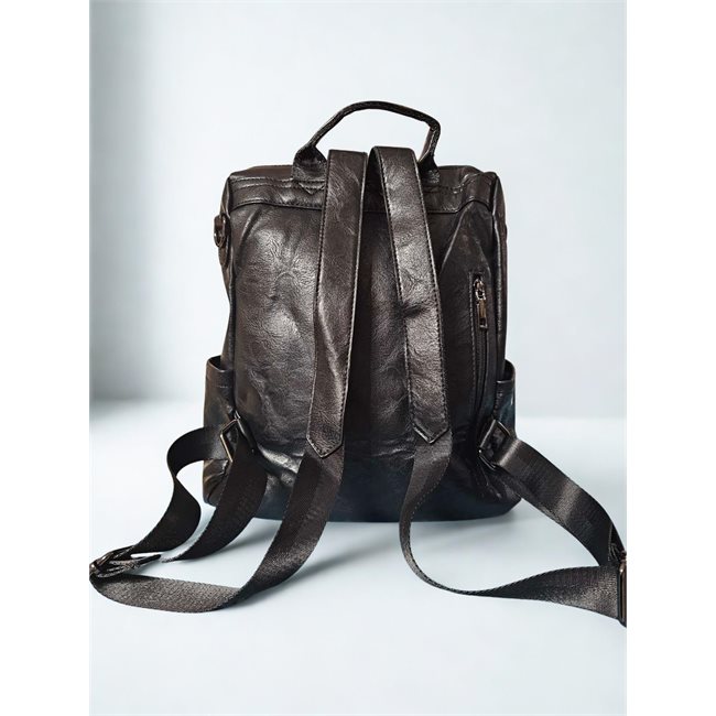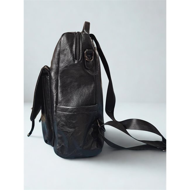 Η μπροστινή τσέπη με καπάκι και διακοσμητικά λουράκια με ασημί τελείωμα προσθέτει χαρακτήρα και λειτουργικότητα.