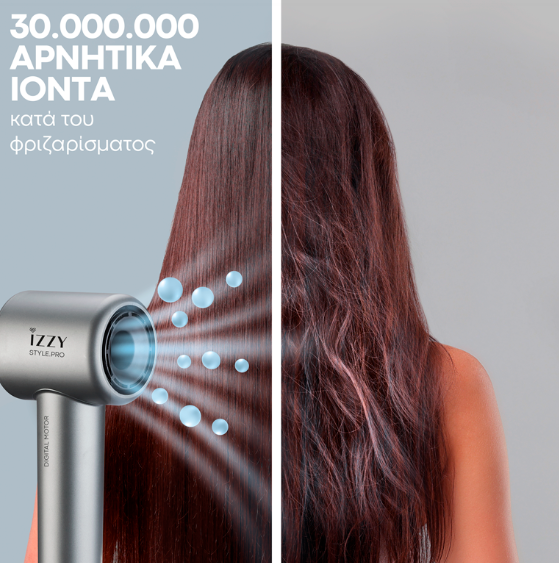 Η ταχύτητα αέρα και η ιονική τεχνολογία εξασφαλίζουν γρήγορο στέγνωμα, προστασία από το φριζάρισμα και υγιή λάμψη στα μαλλιά.